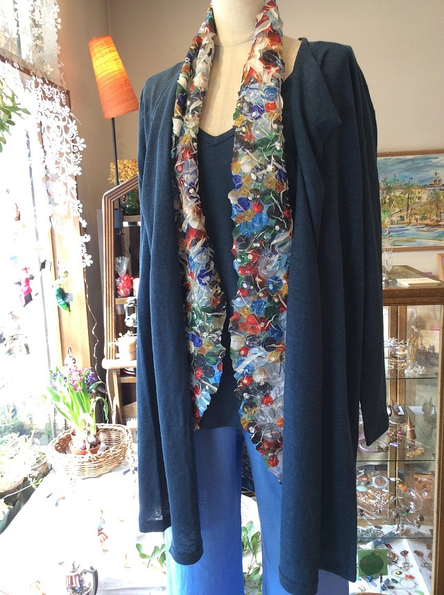 ニットのTシャツ(Vネック半袖10,800円、丸首七分袖12,960円) やカーディガン(14,040円)もリネン100%です。ホワイト、イエロー、ミントグリーン、ラグーン、マリンブルー、フュッシャの6色