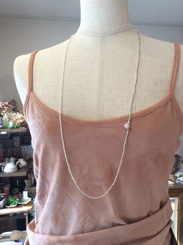 種のように小さいシードパールとシルバー色のメタルビーズを組み合わせたネックレス。ボタン状を外して2重にもつけられます。MARQUISE & PEAR SHAPEという日本のブランドのものです。