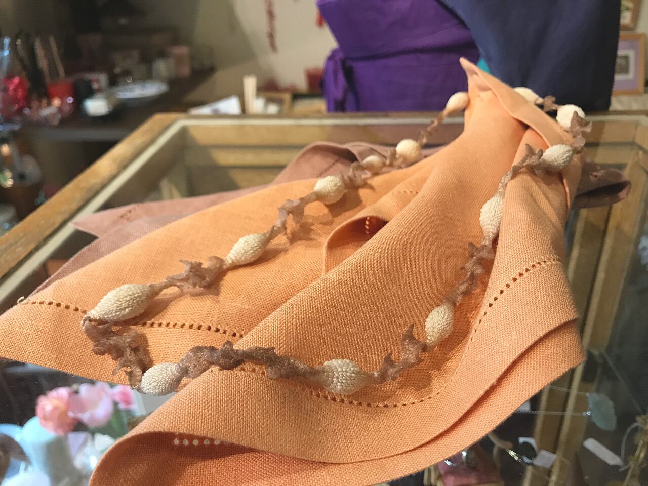 パリのツリ・ゲタは、金属を一切使用しない、シリコンを使ったアクセサリー デザイナー。見た目は貝のように堅そうに見えますが、ゴムのような布のような不思議な質感!彼のアクセサリーはオートクチュールにも使われています。水に濡れても平気なので、ビーチでも活躍するアクセサリーです!!ロング ネックレスは、長さ約90cm 色は、シナモンベージュとライトグレーの2色です。