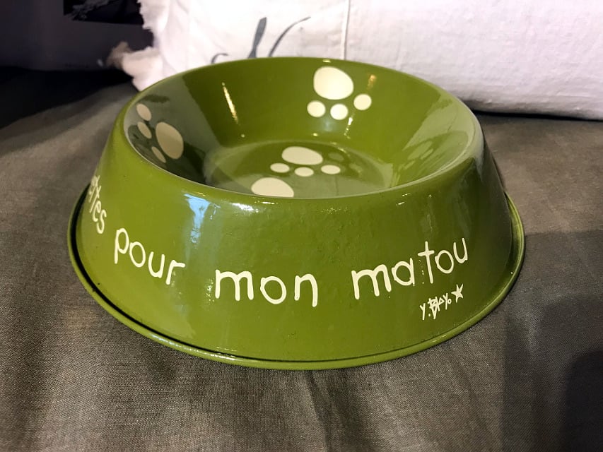 フランス製のアルミにペイントした餌用皿。フランス語で「私の猫ちゃんにカリコリ」と書かれています(クロケットは本来コロッケのことですが、ここではワンちゃんや猫ちゃん用の乾燥フードのこと)肉球がたまらなく可愛いですよね!H5 x 内径15(外径20.5cm)cm