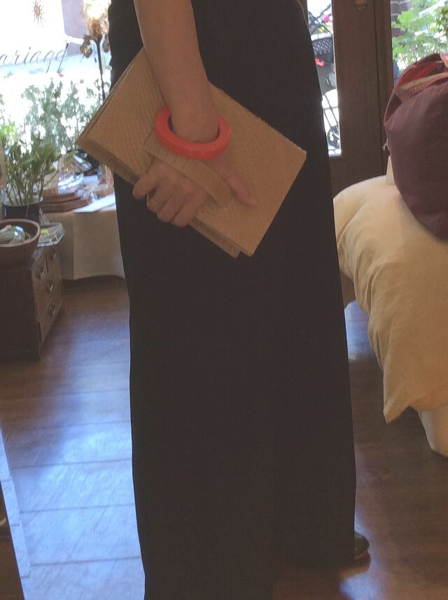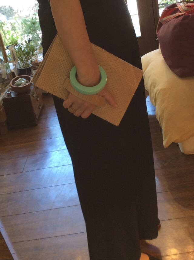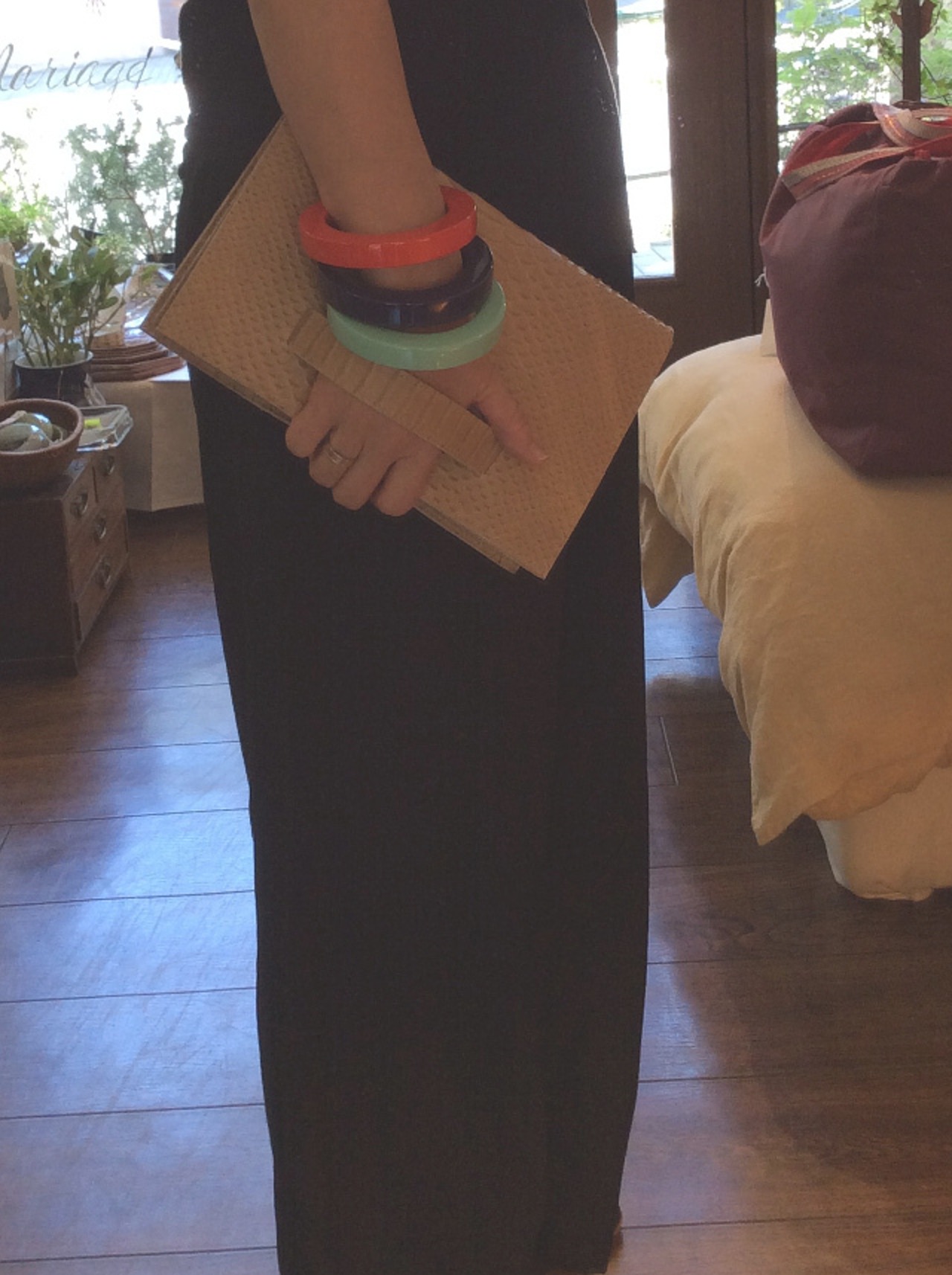 パリのL`INDOCHINEURから到着の木製パーツにラッカーを施した存在感のあるバングルです。流行のミントグリーン、オレンジ、そしてヴァイオレットの3色、重ね付けすると一層ゴージャスな雰囲気に!内径 約6.5cm、外径 約9.3cm