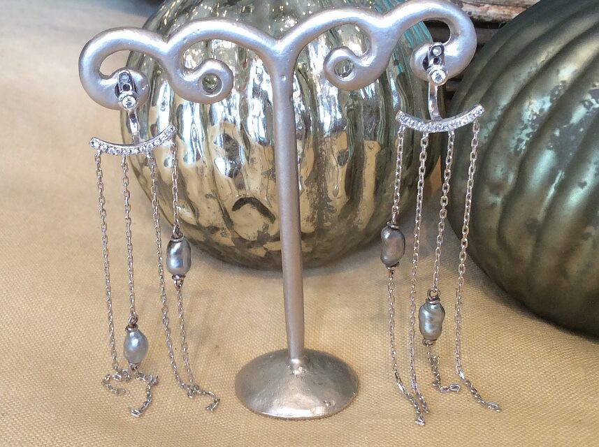 タヒチ産ケシパールとシルバーチェーンの組み合わせが繊細なピアス、トップにジルコンがキラリと華やかさを添えます。ケシパールとは、養殖真珠とは違い人間の手によって入れられる「核」がありません。真珠の母貝に偶然入った砂などから形成される100%天然のもの、採れる真珠全体の0.5~2%ほどしか存在しません、ヨーロッパでは「神様の涙」と言われる由縁です。核が無いので真珠層が厚く、光沢が素晴らしく、汗や酸に強いのが特徴です。