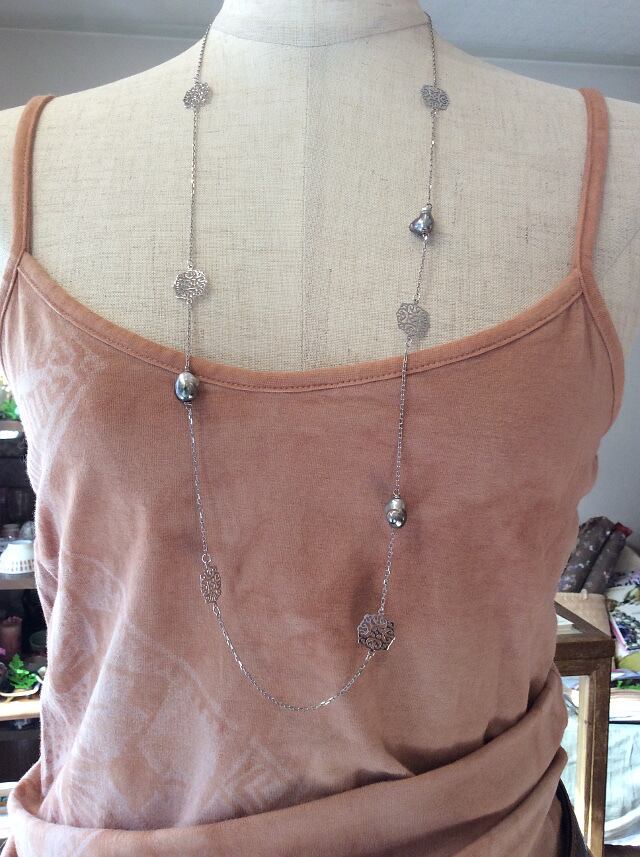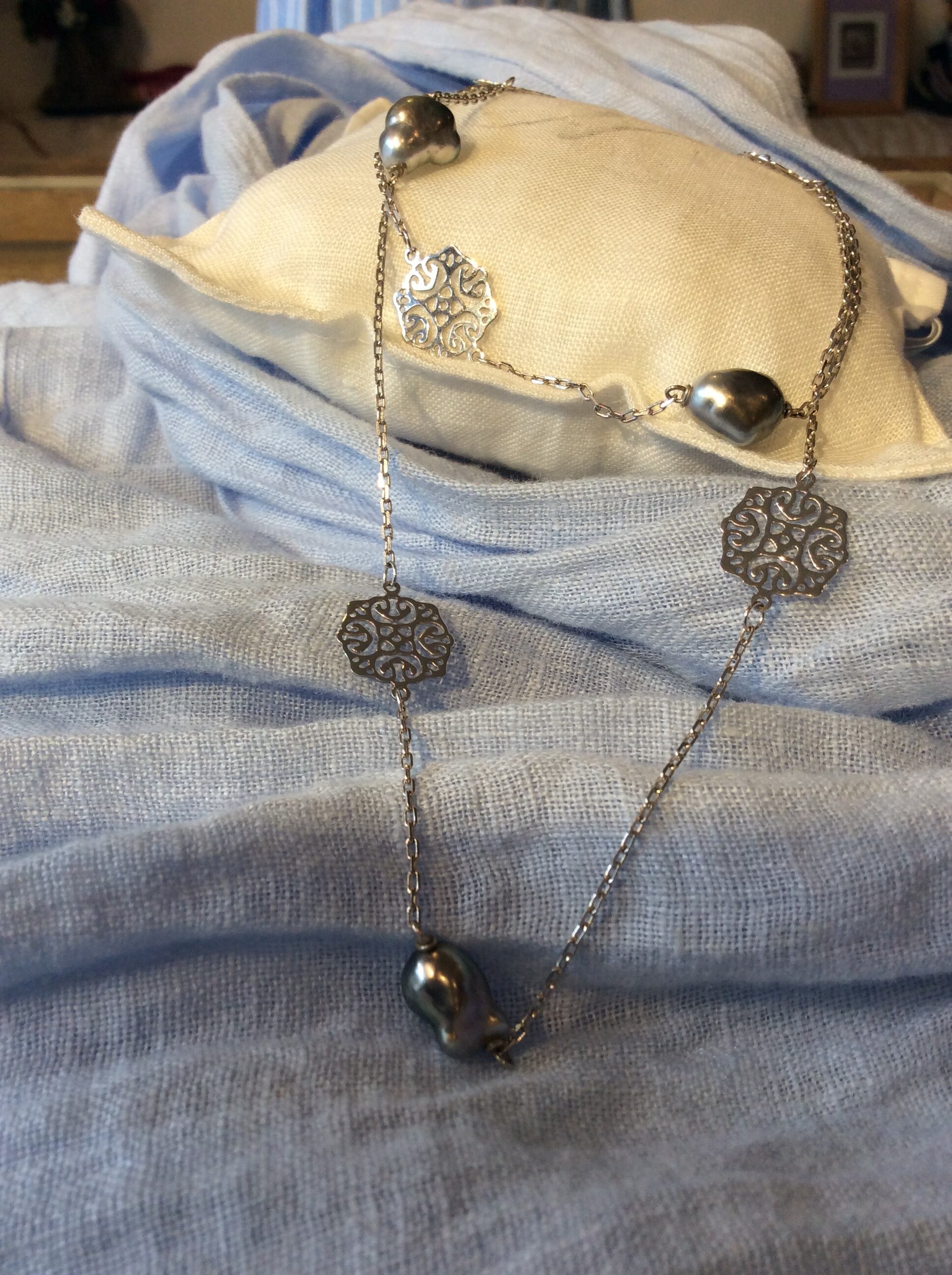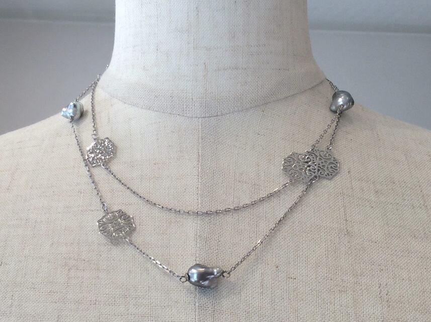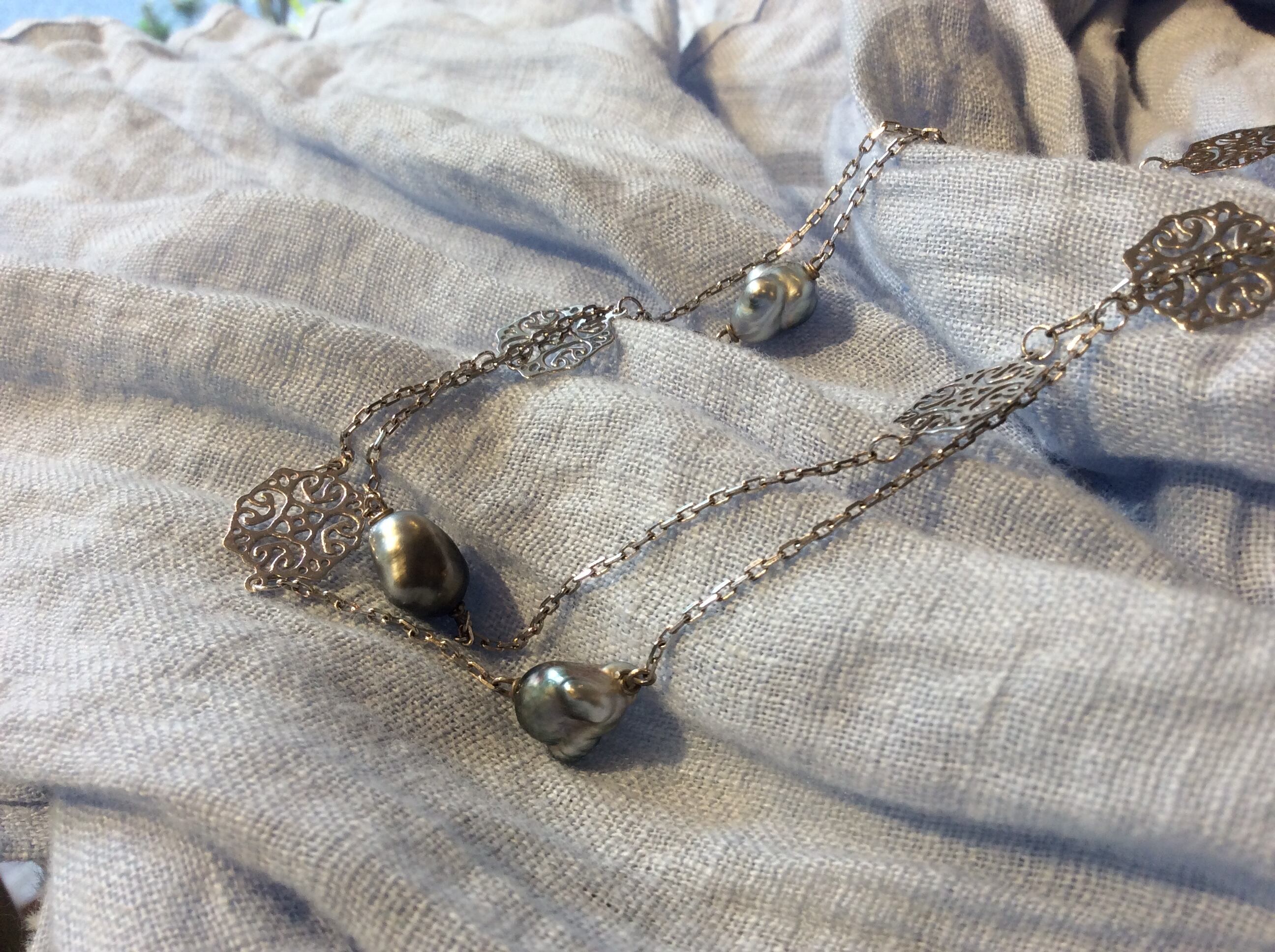 タヒチ産ケシパールとシルバーの透かし模様が美しいネックレス、2重にしたり、お手持ちのネックレスと組み合わせても素敵です!ケシパールとは、養殖真珠とは違い人間の手によって入れられる「核」がありません。真珠の母貝に偶然入った砂などから形成される100%天然のもの、採れる真珠全体の0.5~2%ほどしか存在しません、ヨーロッパでは「神様の涙」と言われる由縁です。核が無いので真珠層が厚く、光沢が素晴らしく、汗や酸に強いのが特徴です。