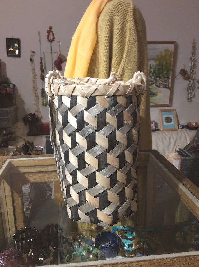 イタヤカエデ細工は1790年から続く秋田の伝統的手工芸ですが、今では数人の職人さんしか残っていない中で4代目菅原清澄さんと5代目 麻巨さんにより作られる籠バッグ 楓の幹を薄く削いで泥染めしたもので編まれています。何十年と使い続けると照りが出てセピア色に変化します。こちらは高度な技術で編まれた当店オリジナルの特注バッグです。高さ21cm(取っ手12cm)、幅28cm、間口16cm、底辺32x11cm