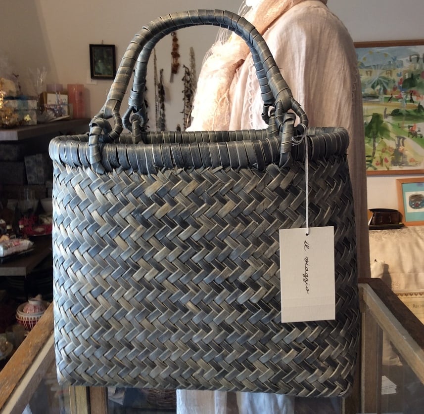 イタヤカエデ細工は1790年から続く秋田の伝統的手工芸ですが、今では数人の職人さんしか残っていない中で4代目菅原清澄さんと5代目 麻巨さんにより作られる籠バッグ 楓の幹を薄く削いで泥染めしたもので編まれています。何十年と使い続けると照りが出てセピア色に変化します。高さ25.5cm(+取っ手14.5cm)、幅31cm、間口17.5cm、底辺30x10.5cm
