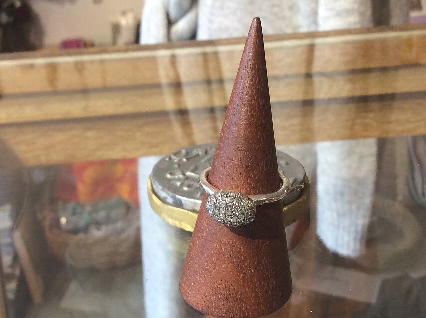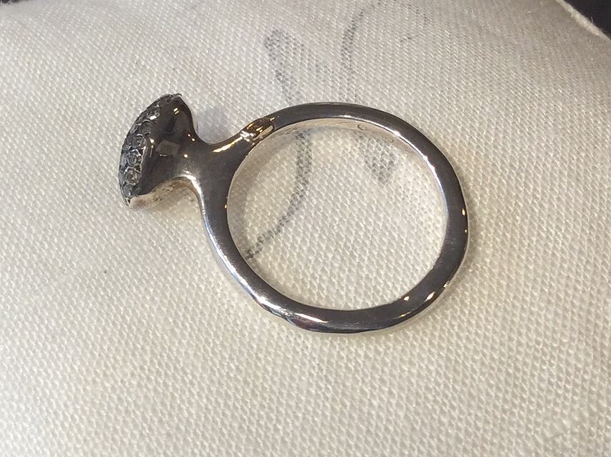 歪に丸くない、手仕事感のあるシンプルなシルバーリングにグレー アイシー ダイアモンドのパヴェがゴージャスです。シンプルなシルバー リングと重ね付けすると一層、素敵です! SILVER 925(温泉などは、成分により色が変色する場合がありますので、ご注意ください。)13号のみ