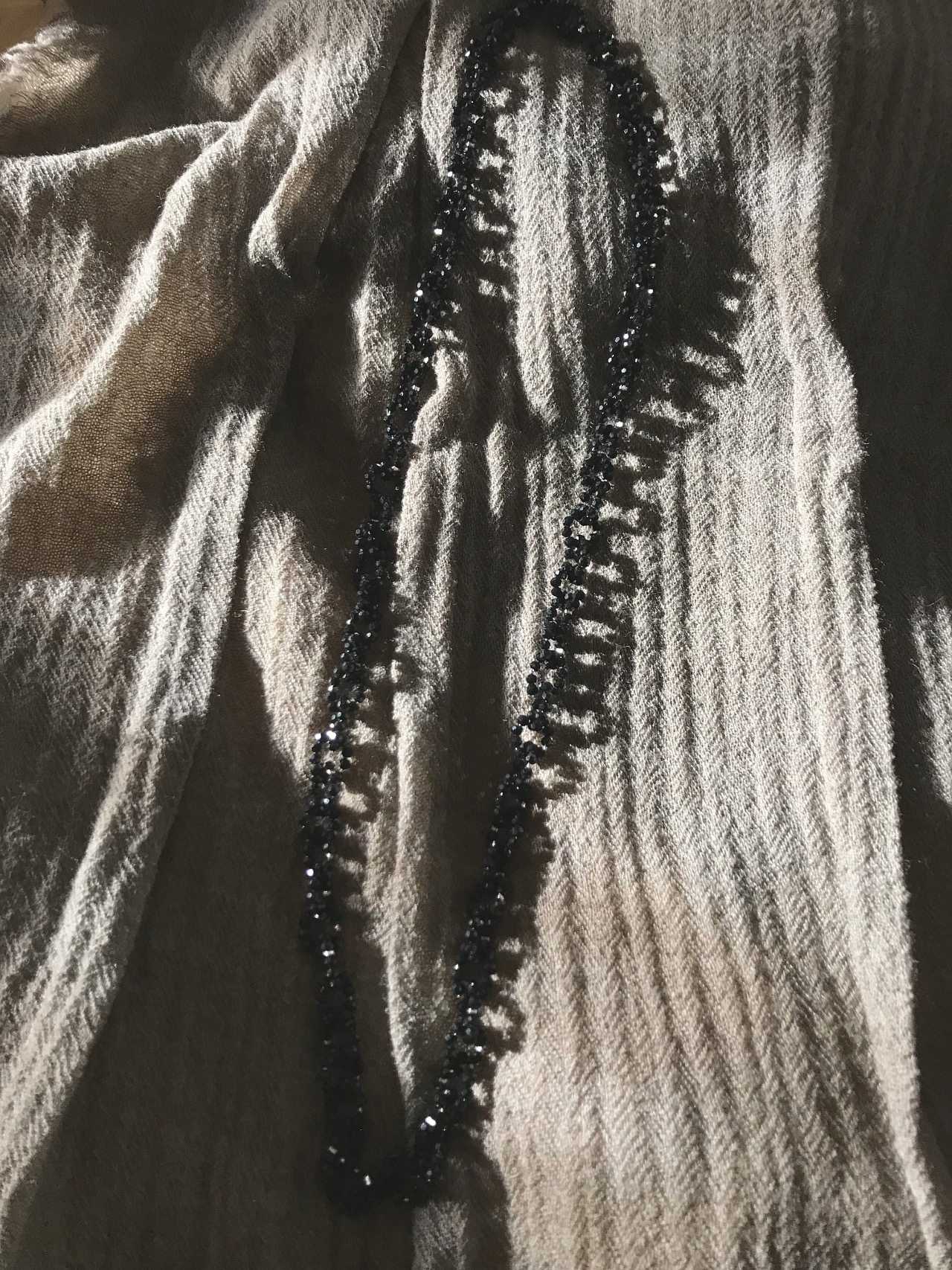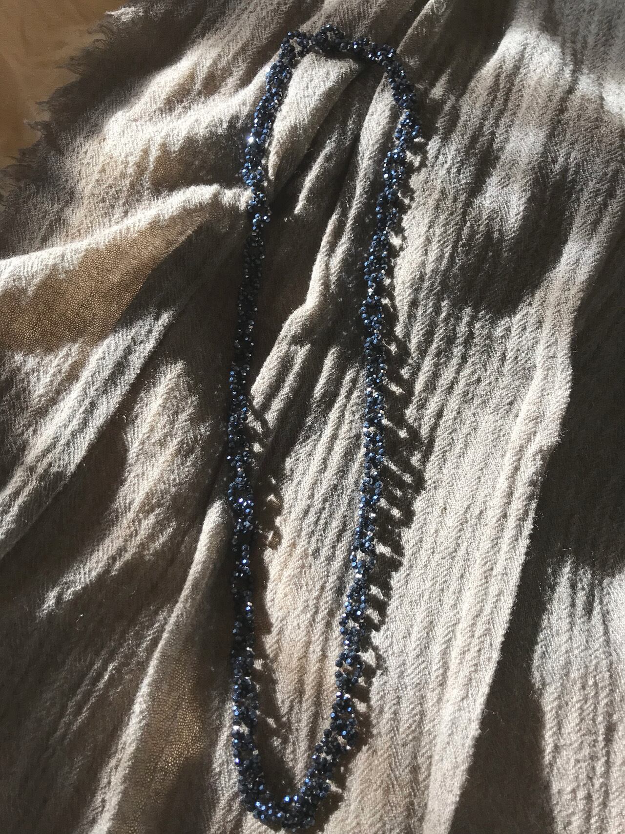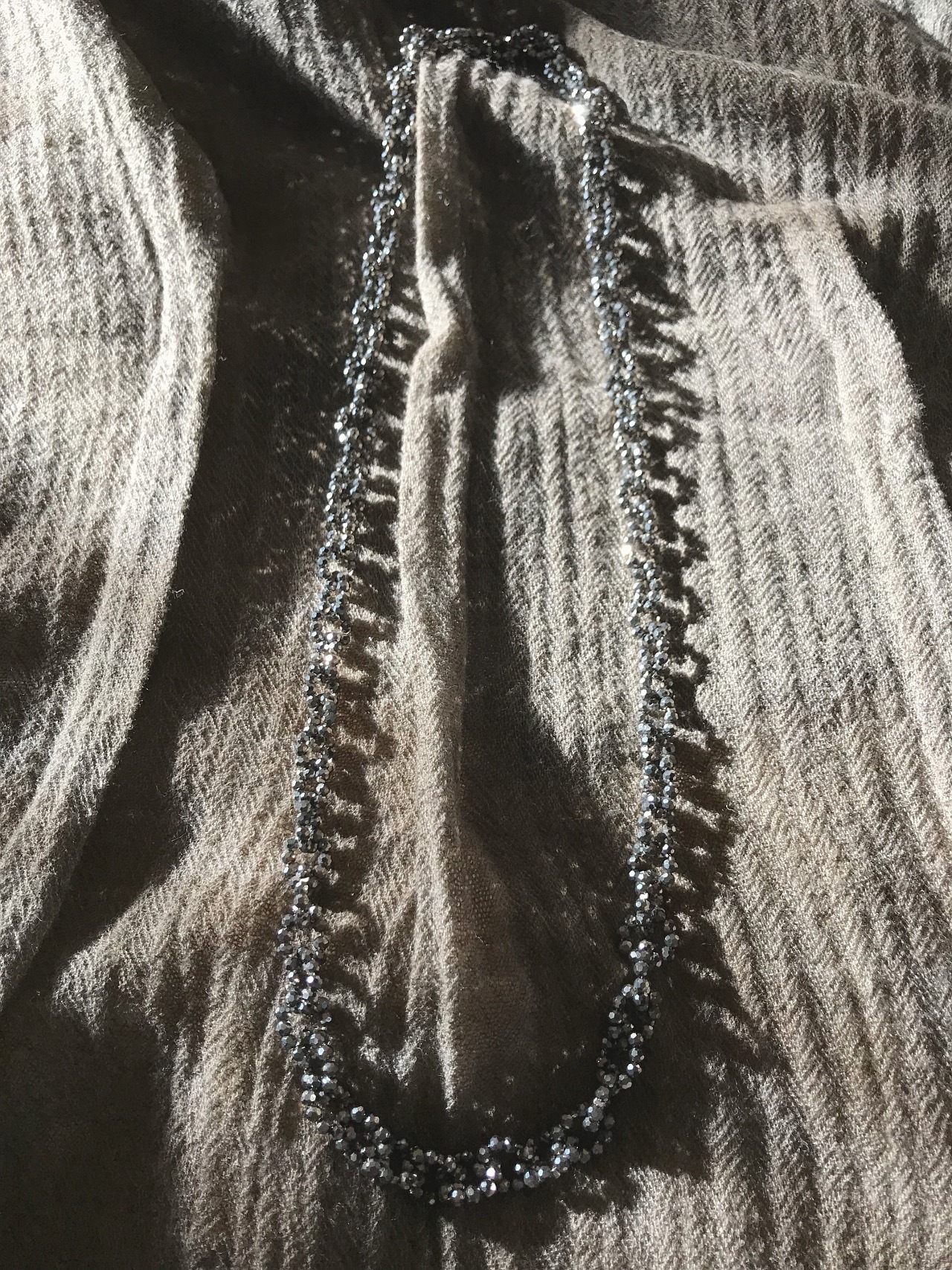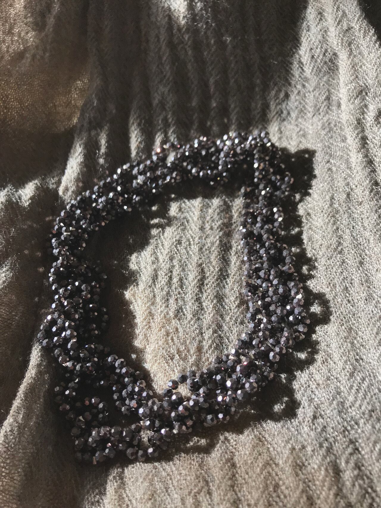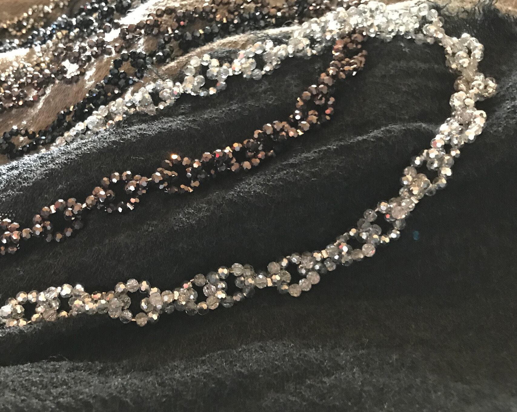 パリから到着、クリスタルビーズをダブルチェーン状に手作業で編んでいるネックレスです。シックな色合いなので、どんな色にも合わせやすいですね。リボンで束ねて2重にするとよりゴージャスに。クリアシルバー、シルバー、ブロンズ、ブルーグレー、ブラックの全5色。