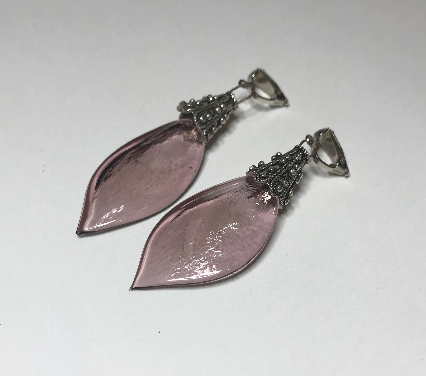 パリの蚤の市で見つけた吹き硝子の葉っぱのパーツと、クラシックなデザインのシルバーを組み合わせたイヤリングです。ライラックのような薄い紫色がフェミニンな雰囲気を醸し出します。金具はフランス製 真鍮です。