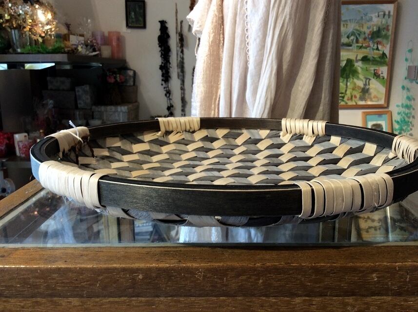イタヤカエデ細工は1790年から続く秋田の伝統的手工芸ですが、今では数人の職人さんしか残っていない中で4代目菅原清澄さんにより作られているアールデコを想わせる3色十字編み 裏に刻印が押されています。楓の幹を薄く削いで白木と泥染めしたもので編まれています。何十年と使い続けると照りが出てセピア色に変化します。高さ3cm、直径39cm