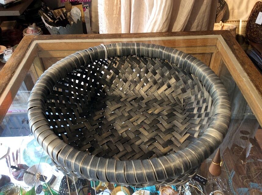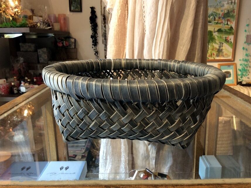 イタヤカエデ細工は1790年から続く秋田の伝統的手工芸ですが、今では数人の職人さんしか残っていない中で4代目菅原清澄さんと5代目 麻巨さんにより作られる丸籠 底は四角というもの面白いです! 楓の幹を薄く削いで泥染めしたもので編まれています。何十年と使い続けると照りが出てセピア色に変化します。高さ8cm、直径21cm、底辺14x14cm